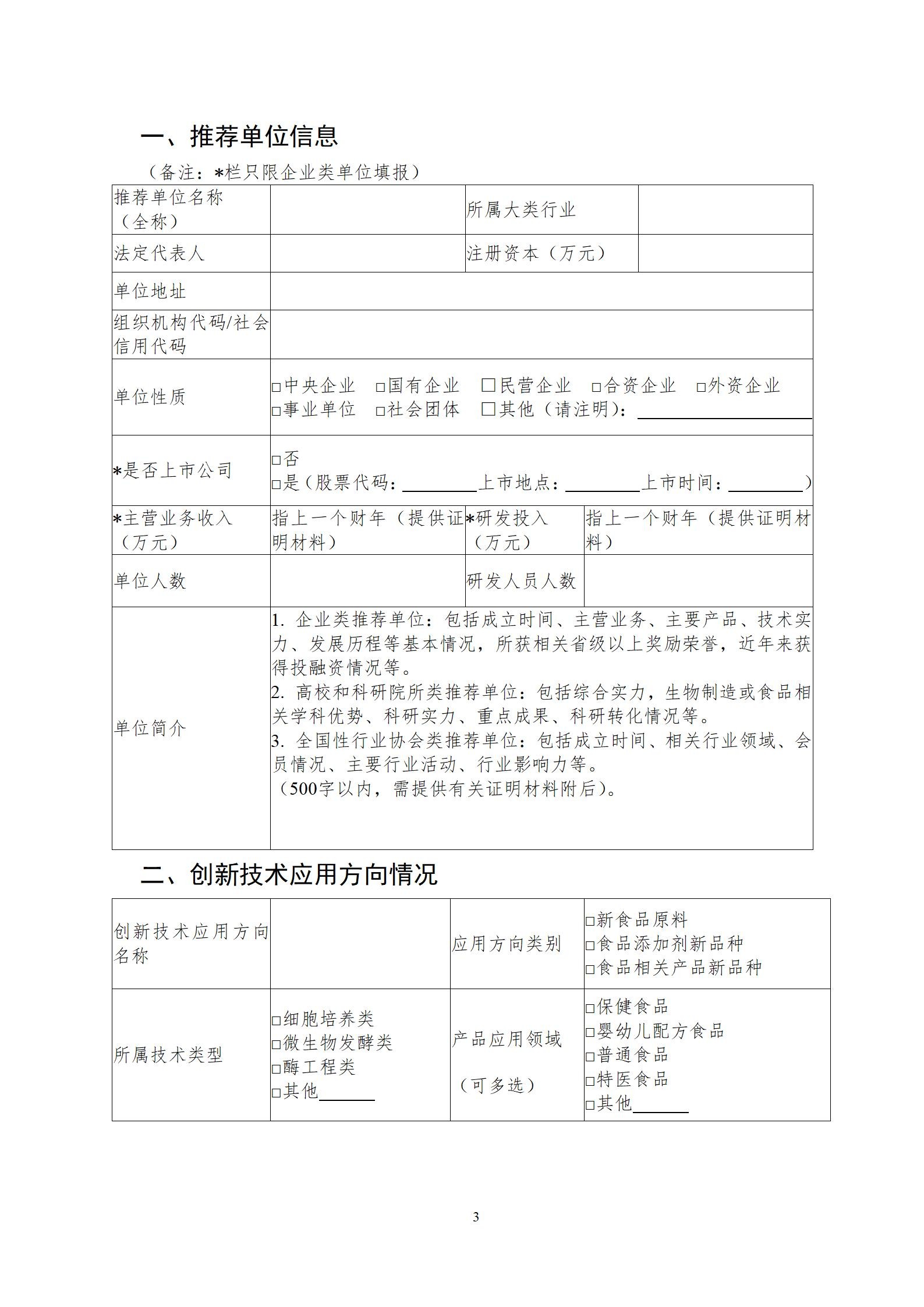 推荐单位自愿填写《食品加工领域生物制造创新技术应用方向推荐表》(见附件),随附相关证明材料,加盖推荐单位公章。推荐材料应详实有据,无知识产权纠纷,不涉及商业秘密等内容。